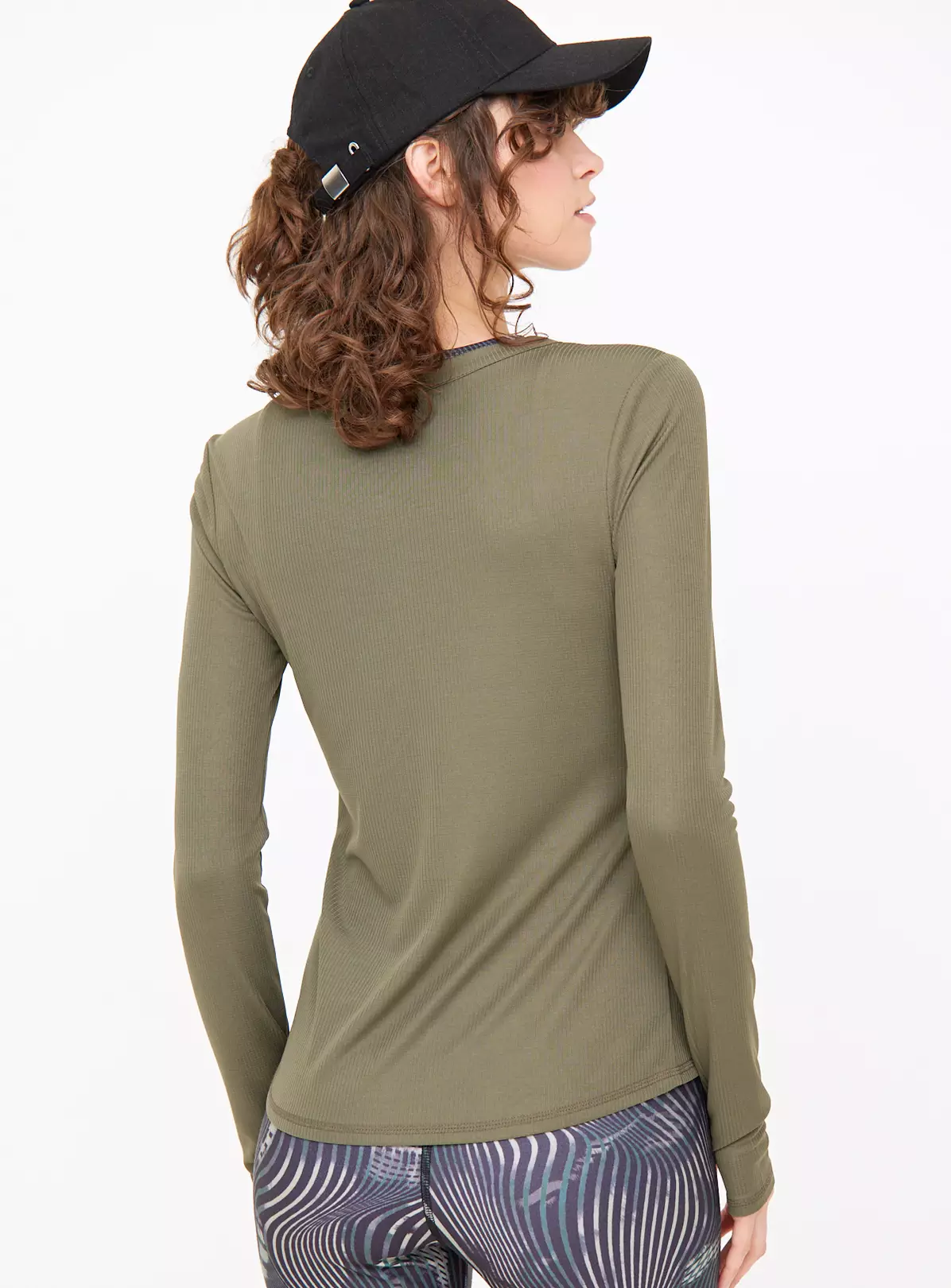Refresh your sporty wardrobe with our staple khaki long sleeve top. It features thumbhole details, perfect for adding a modern touch to your gym looks. Team it with a pair of high waisted leggings for the ultimate outfit.