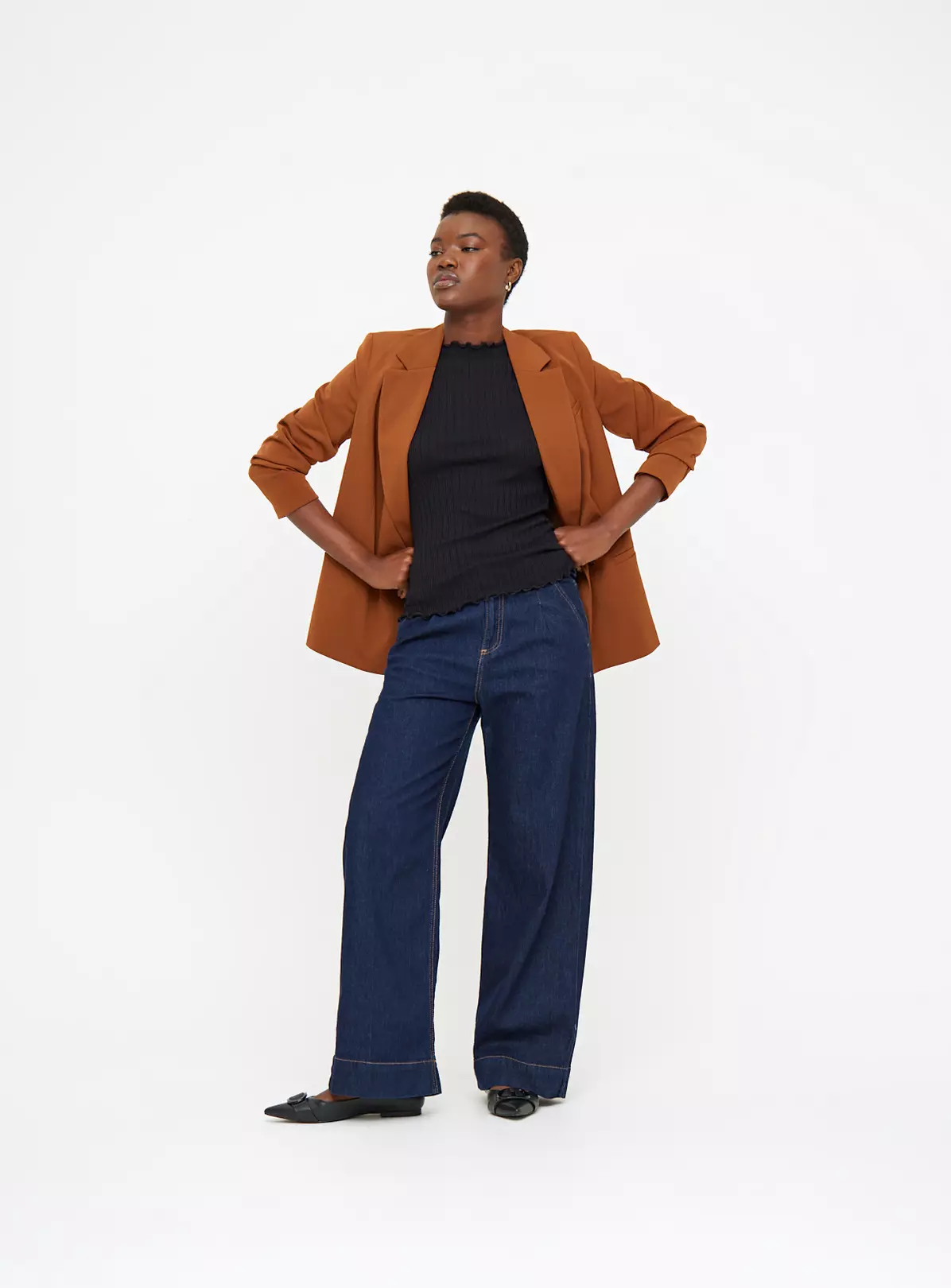 Elevated by a flattering lettuce hem, our black top comes in a comfy ribbed fabric, perfect for all-day wear. For a current look, team it with our wide leg denim jeans and a pair of black pumps.