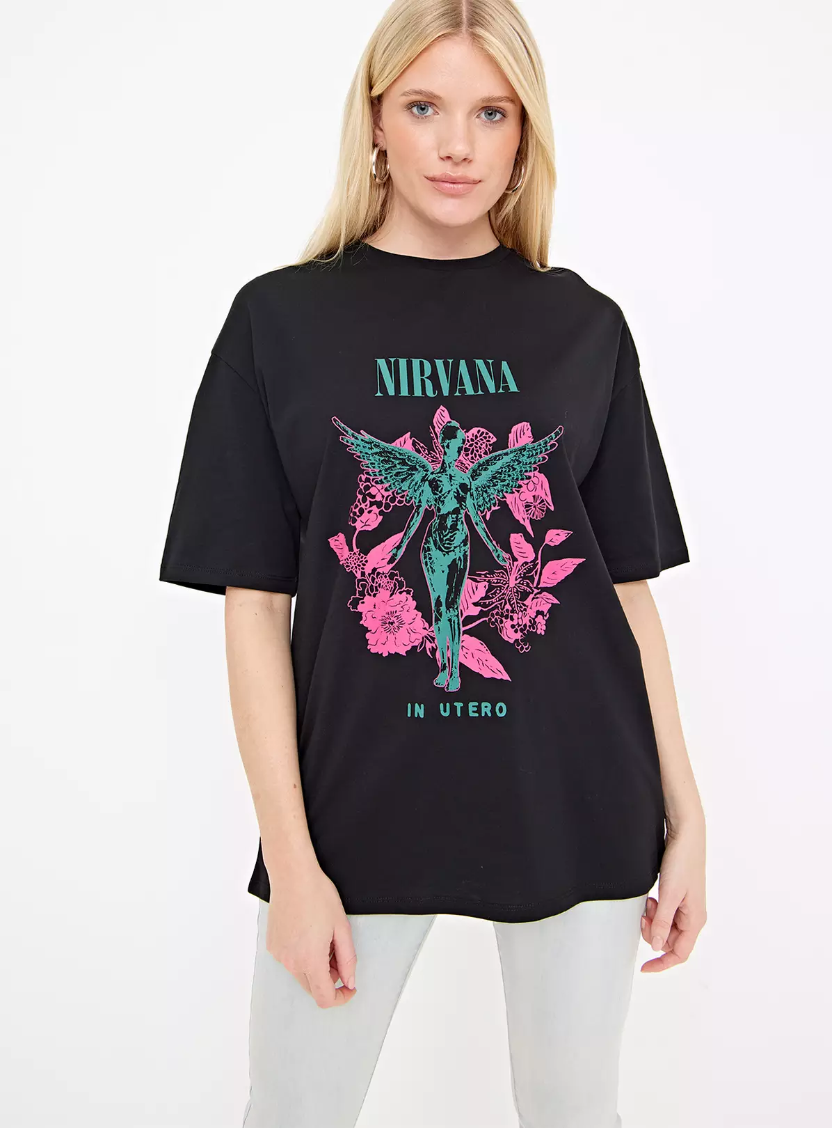Combining comfort with effortless style, our black t-shirt features a cool Nirvana graphic print on the front. In an oversized fit, it has short sleeves and a classic crew neckline. It’s the perfect partner for skinny fit denim jeans.