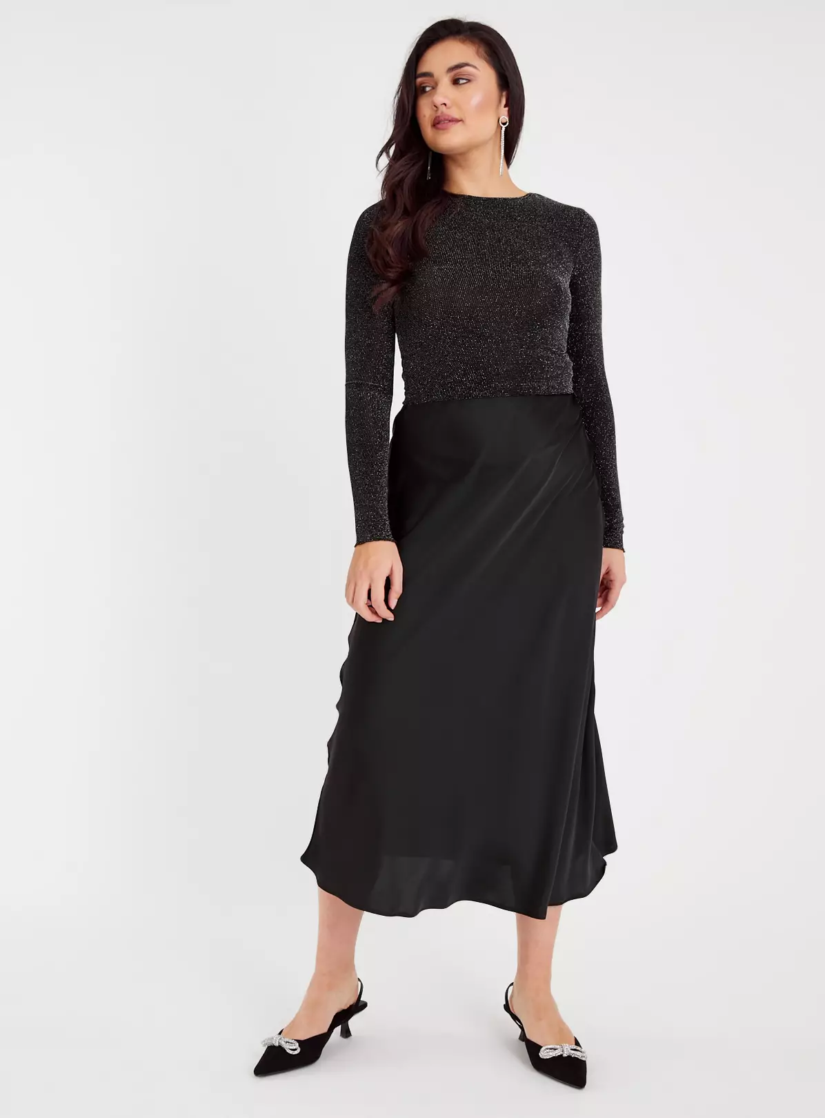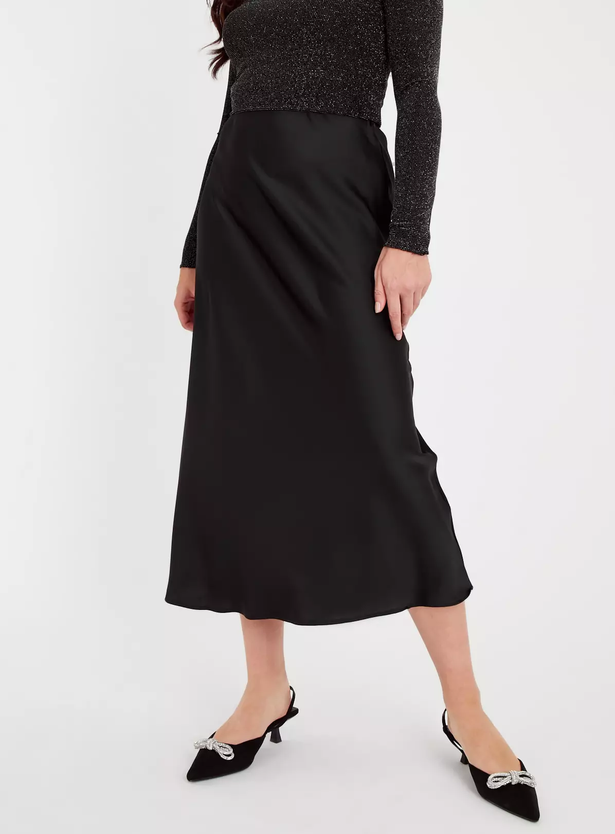 If you’re itching to gear up for party season, you’ll love this black swishy midaxi skirt. Crafted from a super sleek satin with a subtle yet flattering A-line cut, it clings in all the right places and looks fab with a glitzy top and kitten heels.