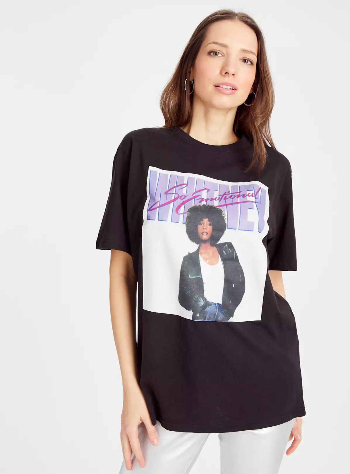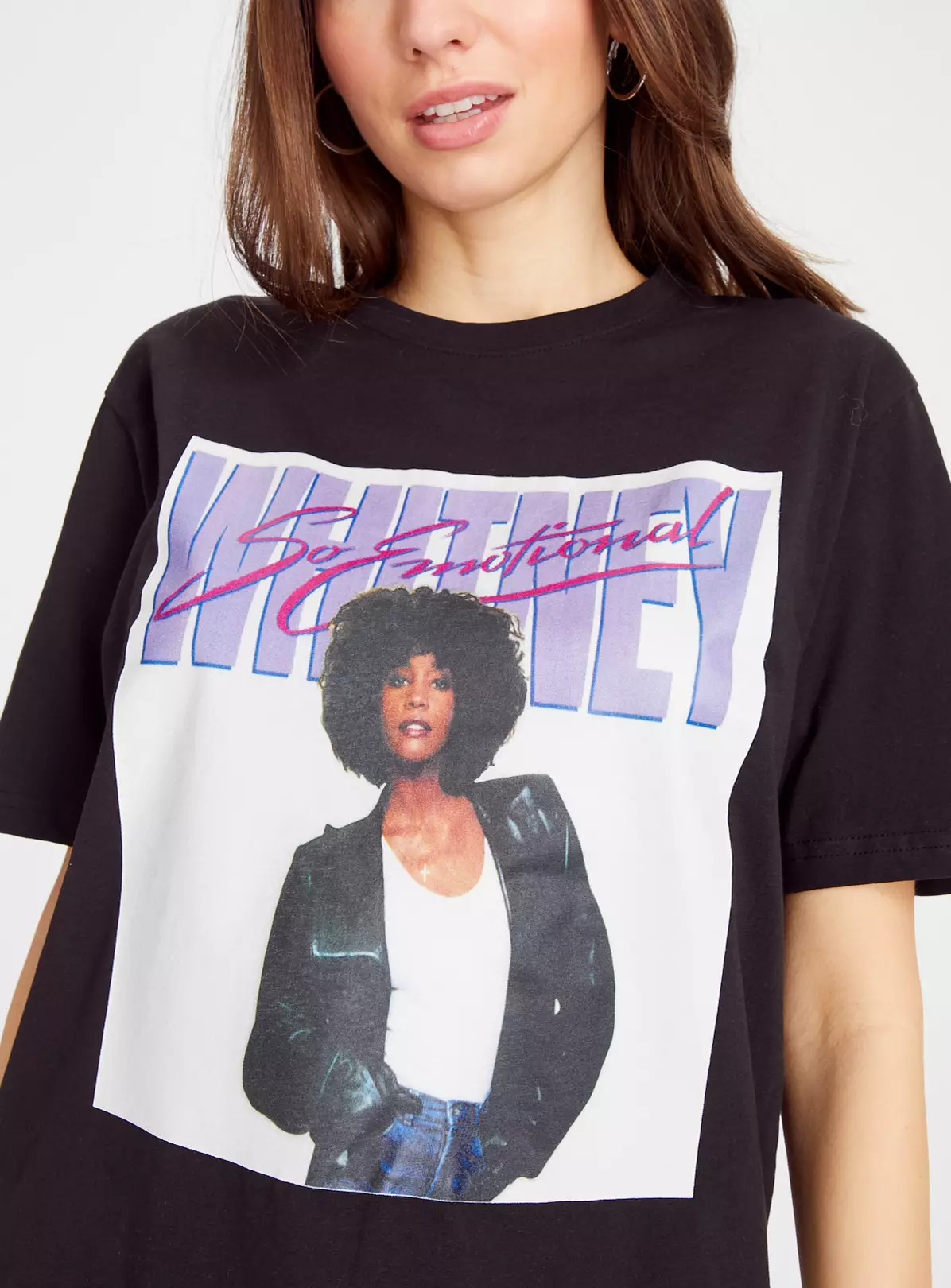 Whitney fan? Then this is the perfect tee for you! Our black t-shirt comes with a crew neckline and short sleeves featuring a classic front graphic print. Team it with denim jeans for an effortlessly chic weekend look.