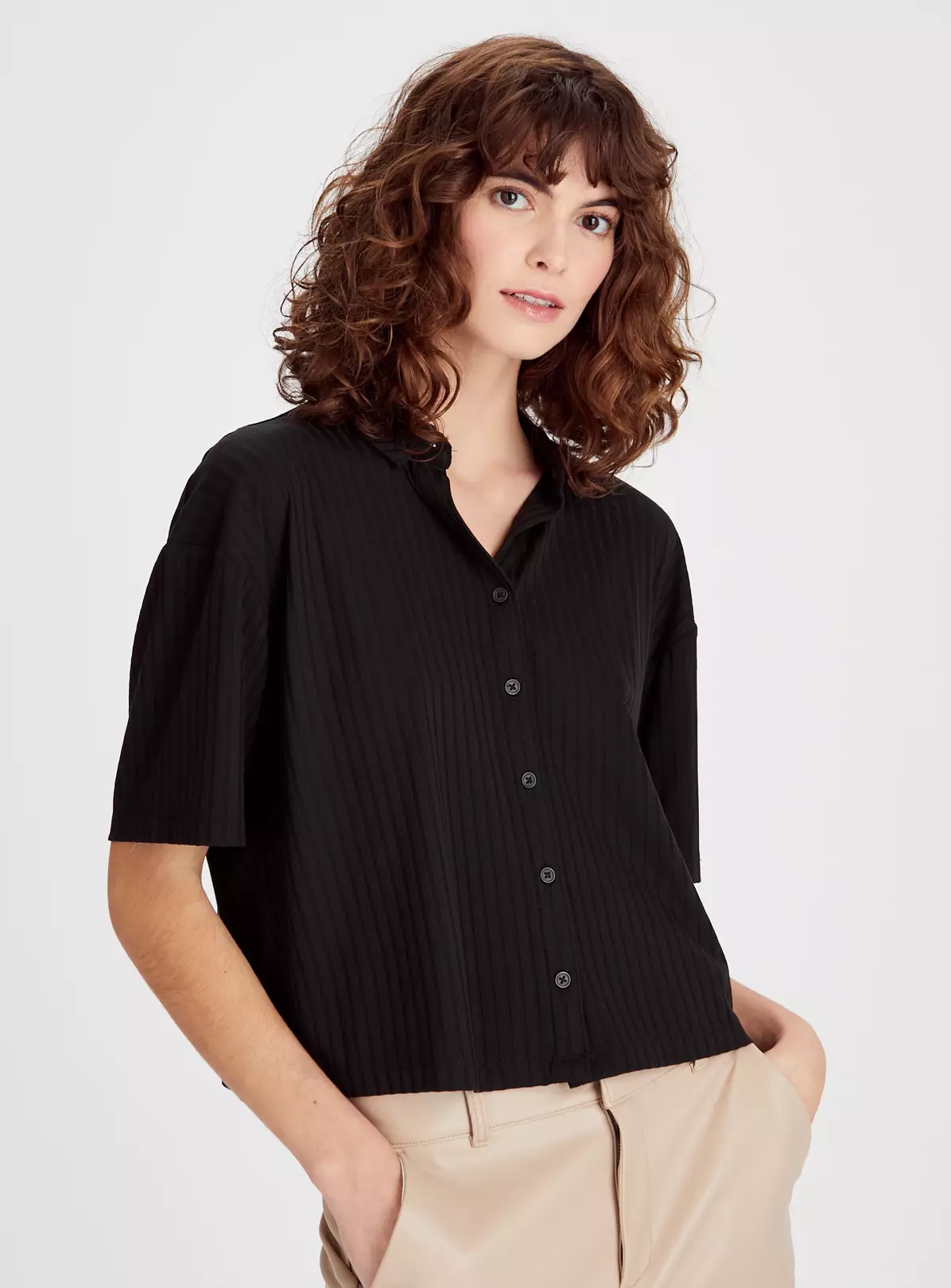 Elevate your look with our black short sleeve shirt. Featuring a wide ribbed design, it comes in a flattering boxy fit. For an effortlessly chic look this season, team it with a pair of high rise denim jeans.