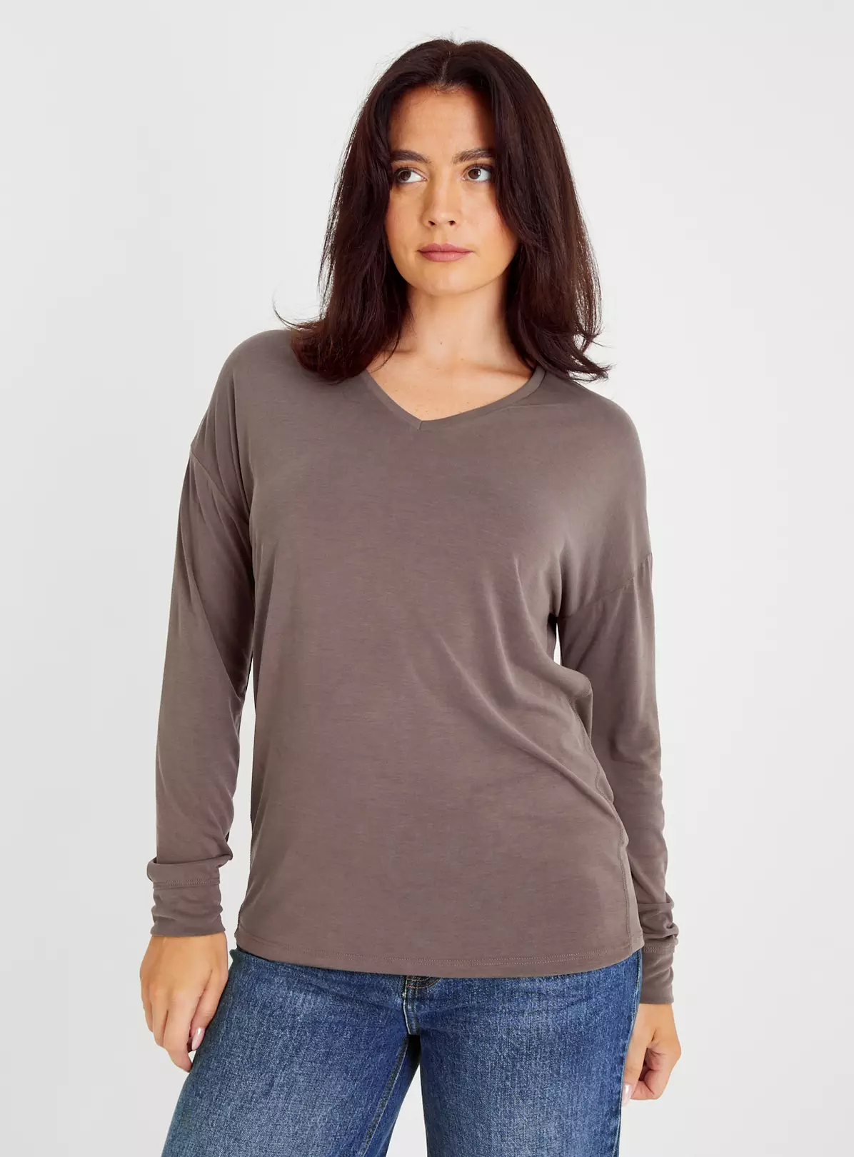 Build up on your basics with this brown relaxed fit top. Featuring a flattering v neckline, it comes in a lightweight comfy fabric. Perfect for layering, style it with blue denim jeans and a black gilet.