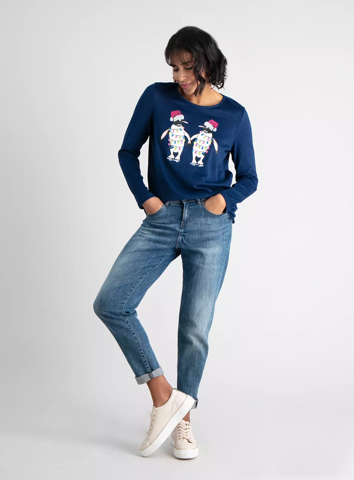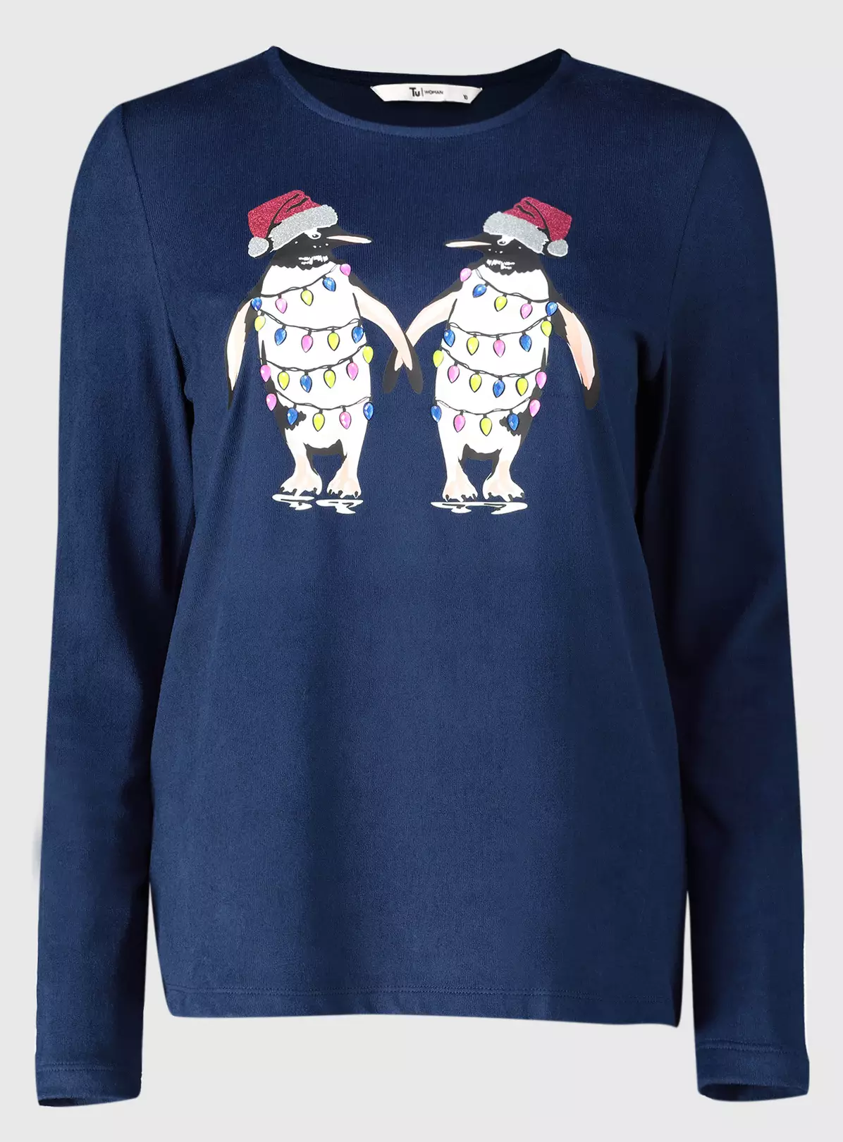 For those days when there is a slight chill in the air and you want to pop on something warm and cosy, our adorably festive navy penguin knitlook top will fit the bill. Designed with a classic crew neck and long sleeves, team with denim jeans for a cute look outfit this Christmas.