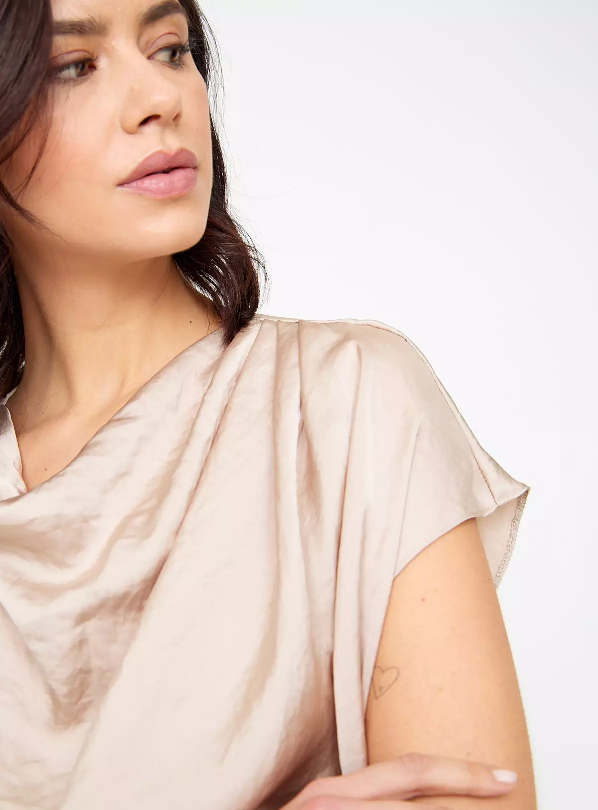 Make a statement in our staple cream satin top. With a flattering cowl neck and short sleeves, team it with trousers and heels for an evening look, or dress it down with a pair of jeans and trainers.