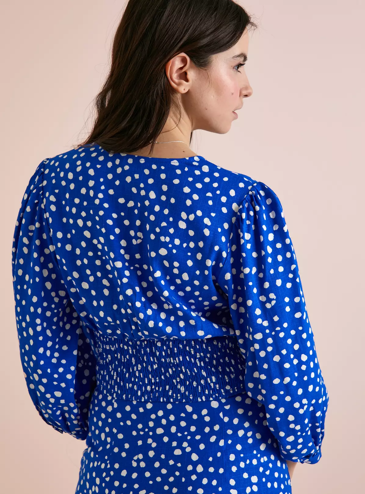 - Defined by its blouson sleeves and beautiful shirring at the back