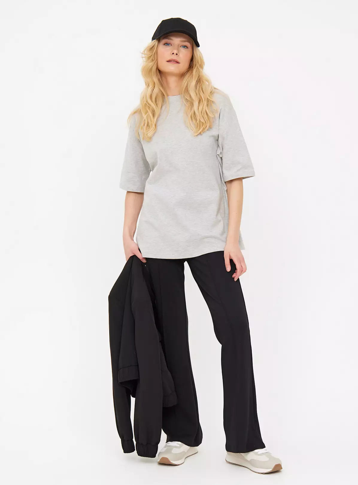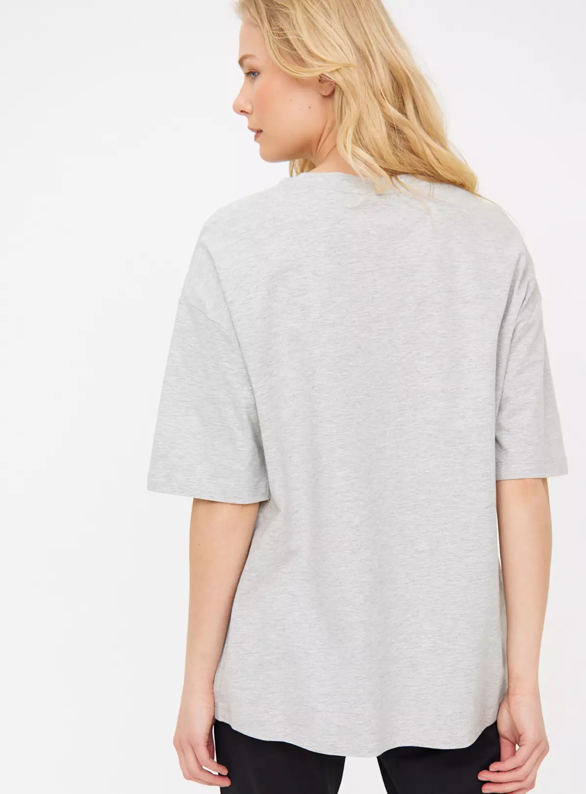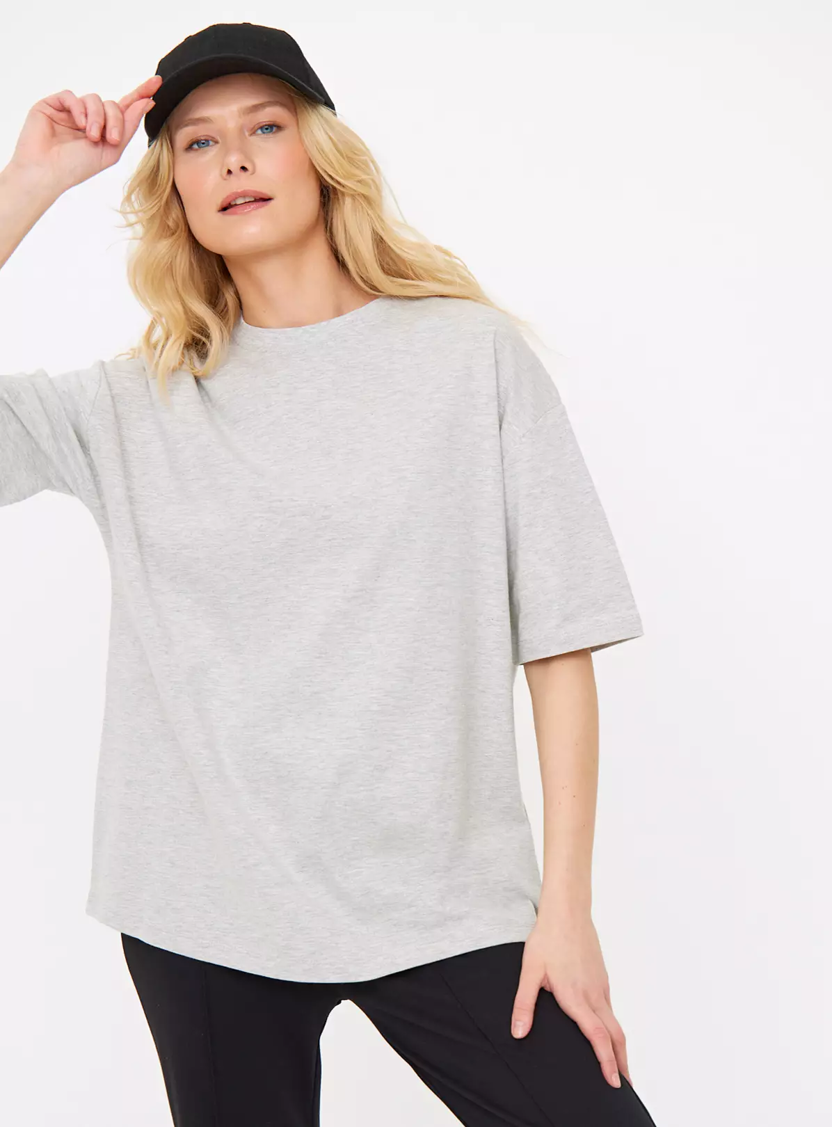 Add a simple staple to your wardrobe with our grey t-shirt. In a flattering oversized fit, it’s a versatile option for everyday wear. Finish your look with a pair of mom jeans and your go-to trainers.