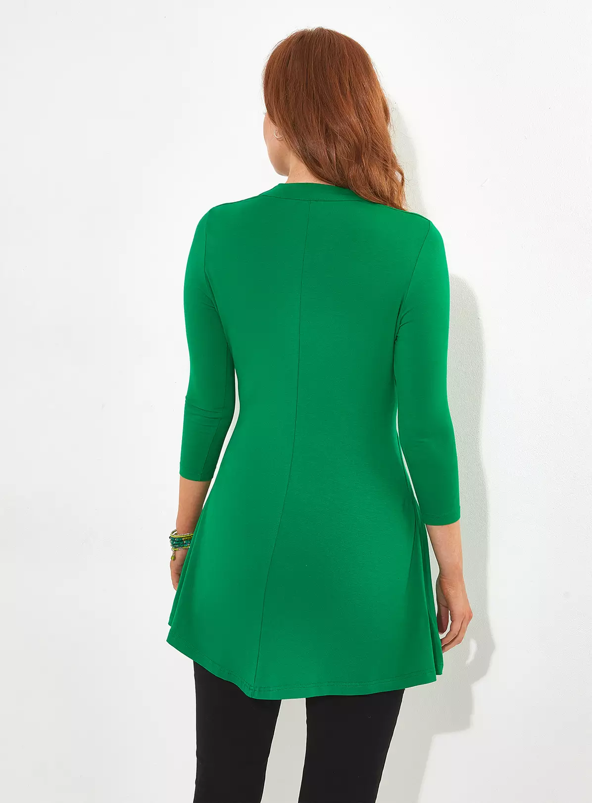 Mock-wrap tunic with a stylish hanky hemline and unique value detailing.