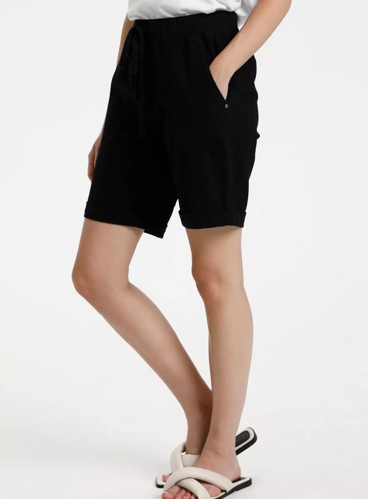 Elasticated cotton shorts for comfy summer vibes. Ideal for beach getaways or active trips. Above knee, turn-up hems, denim-look finish.
