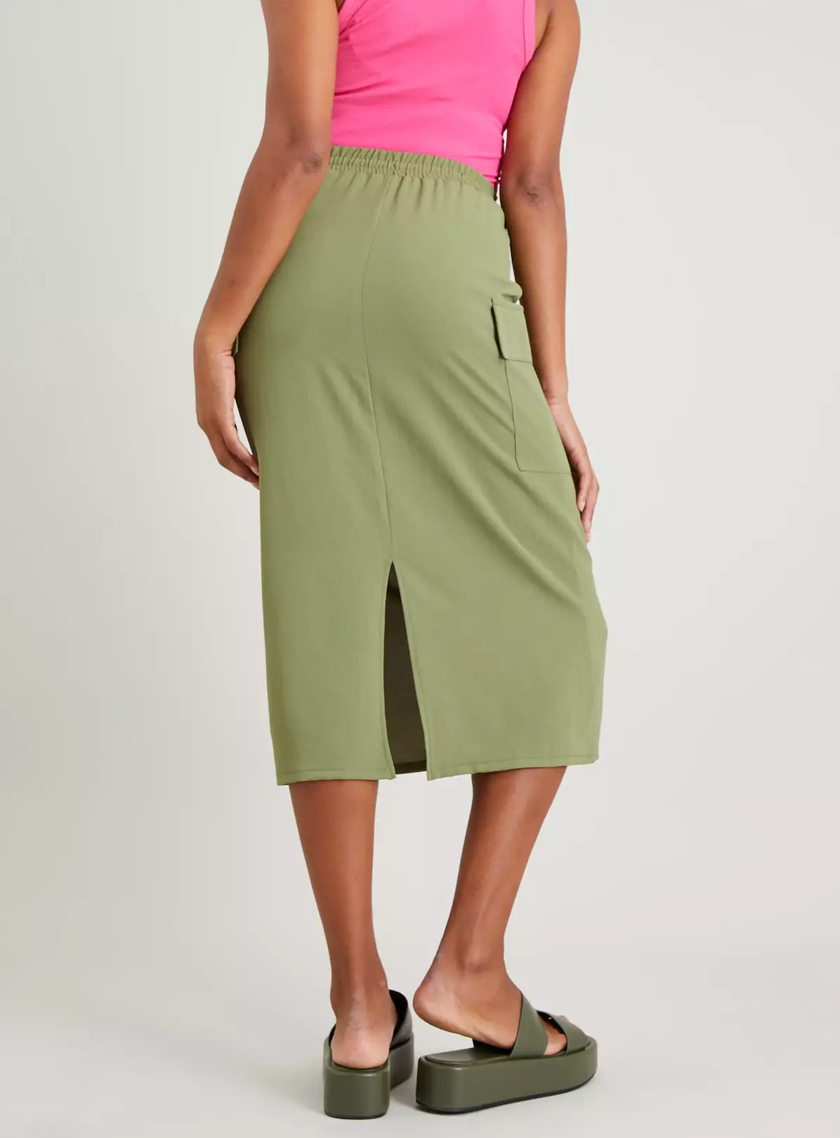 Are you a fan of cargo trousers? Then you’re going to love this Khaki cargo skirt. In a lightweight fabric, it has an easy pull-on waist, cute non functional cargo pockets and a front vent. Team with a vest top and sandals for a warm weather look.