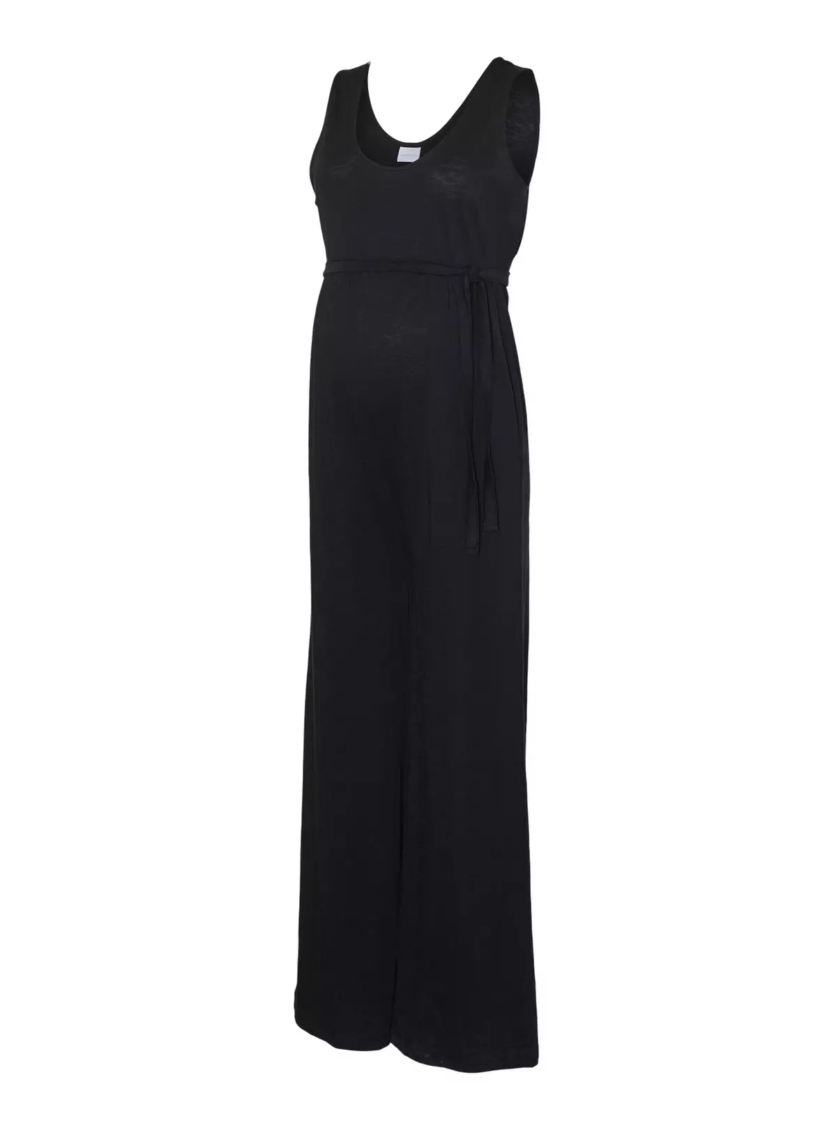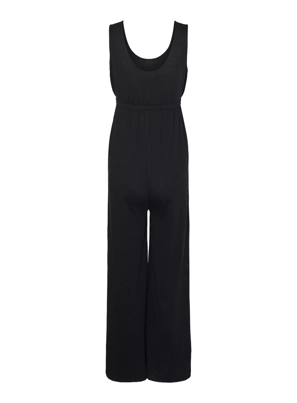 Maternity jumpsuit with elastic at waist and deep o-neck front and back.