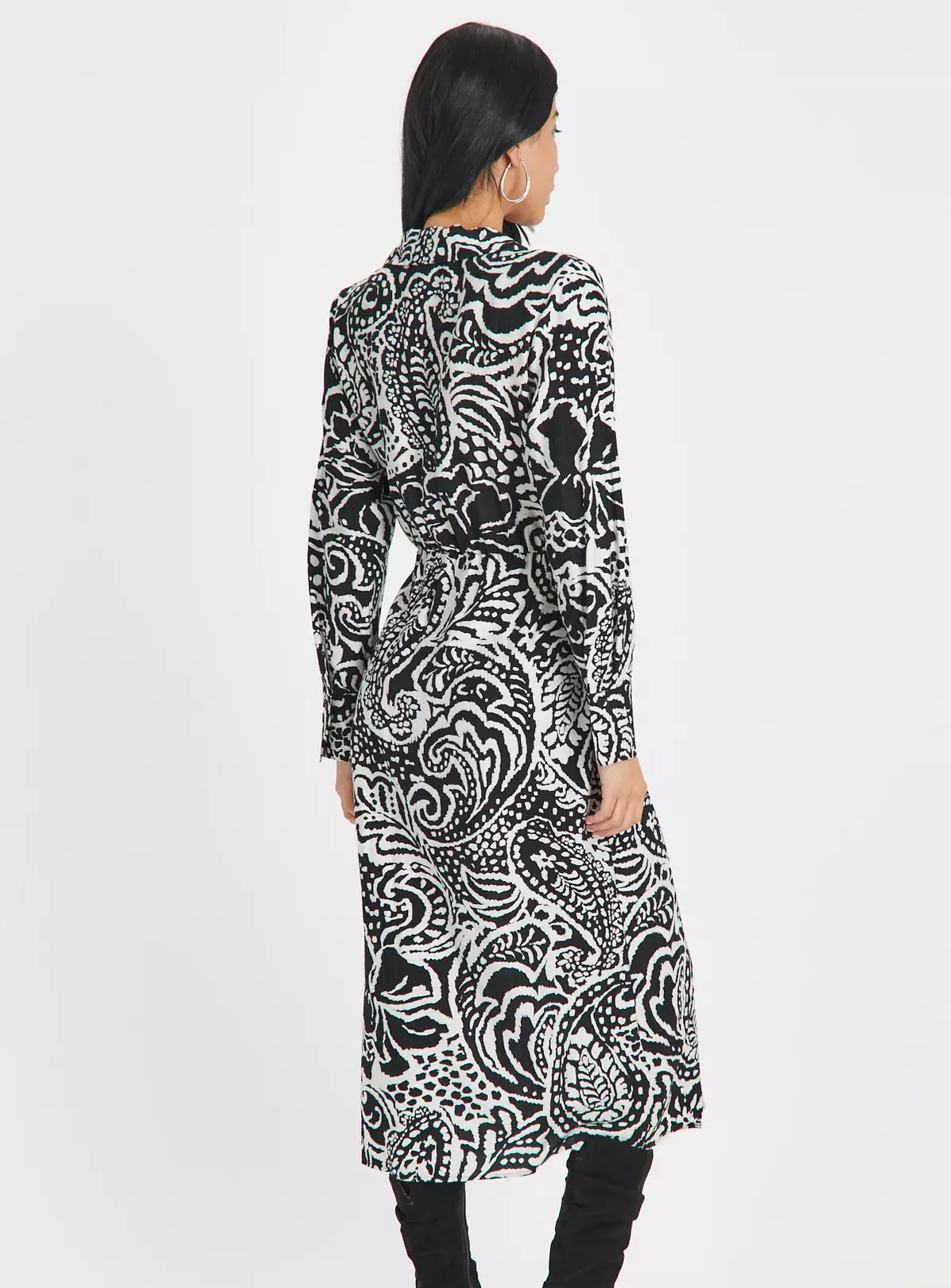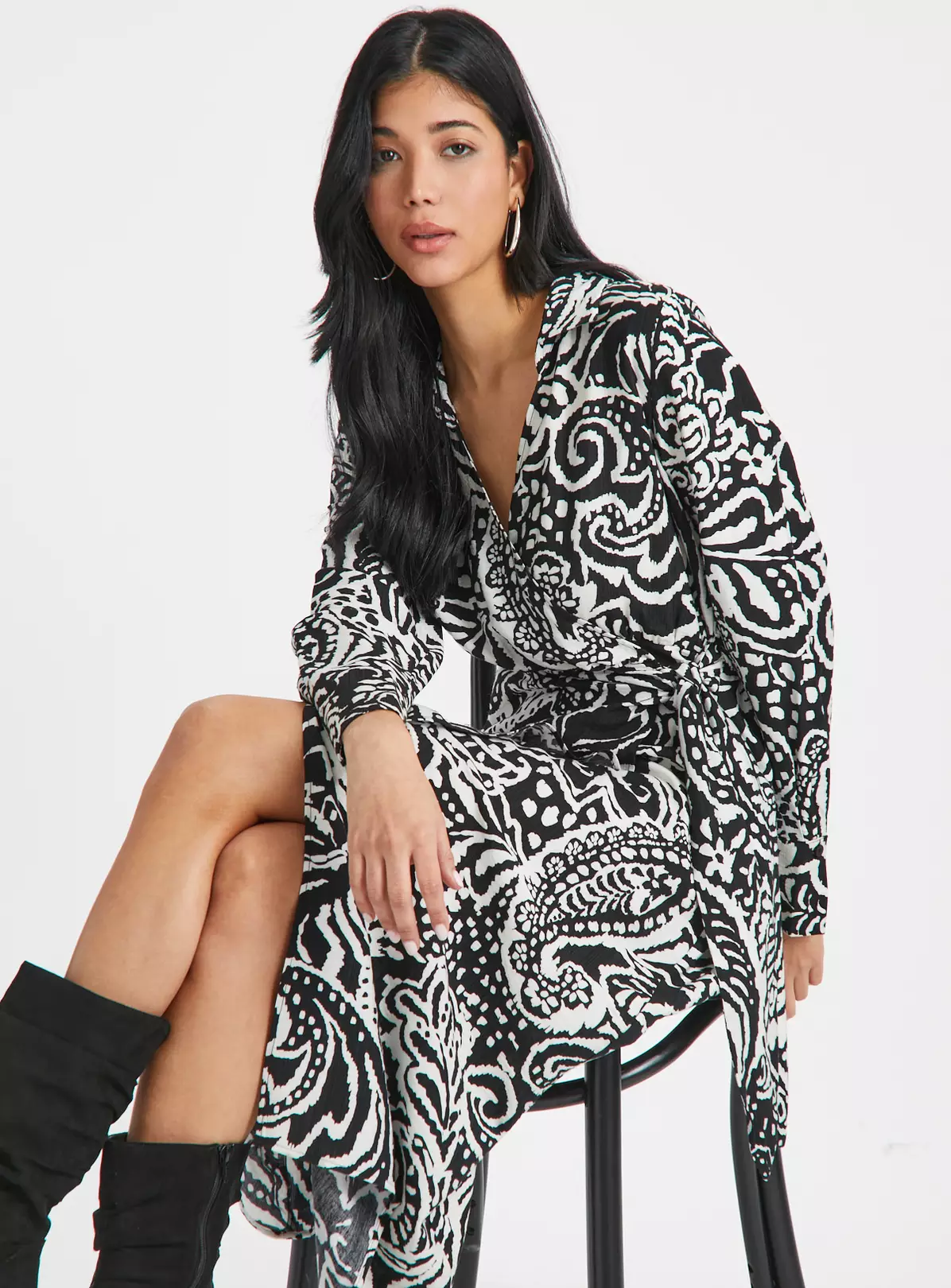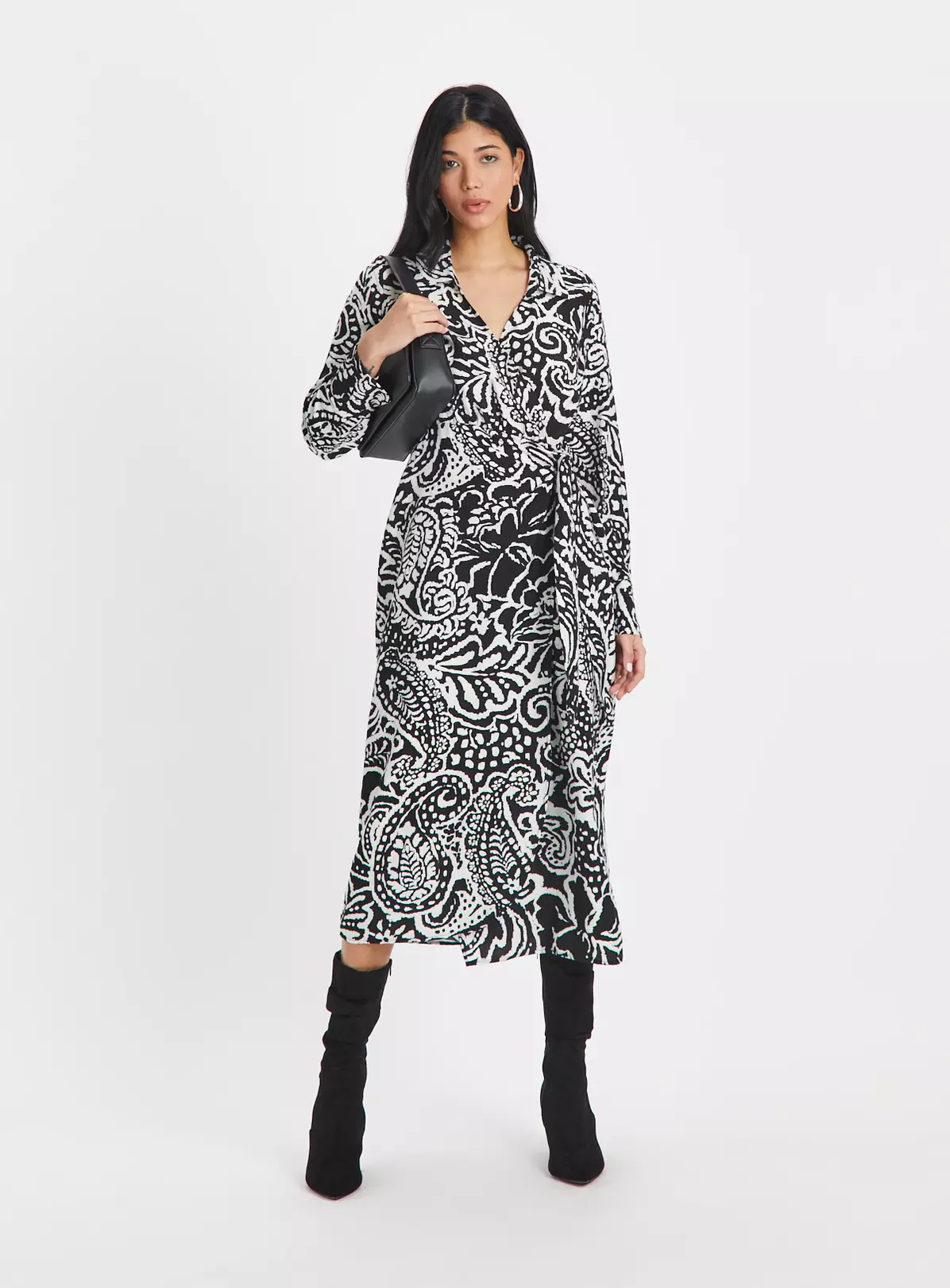 Make an entrance in our statement midi dress. It’s elevated by a wrap over design, with a stunning tie detail and V neck open collar. In a classic mono colorway, it features a floral print, perfect for pairing with boots.