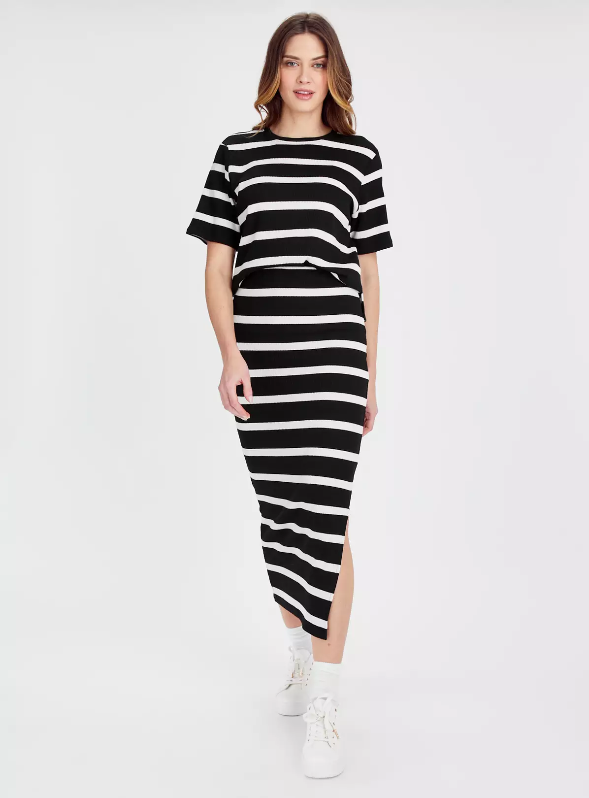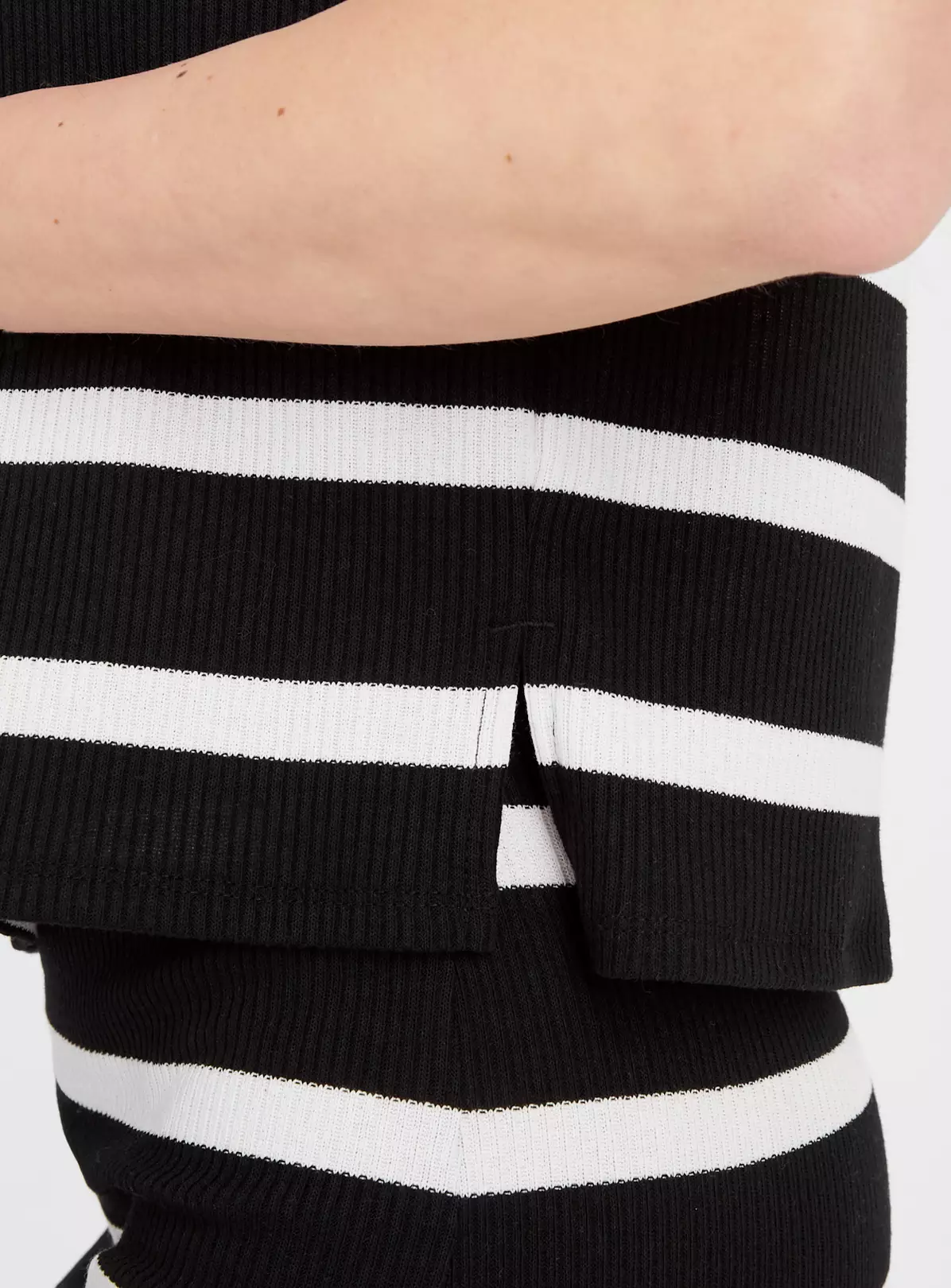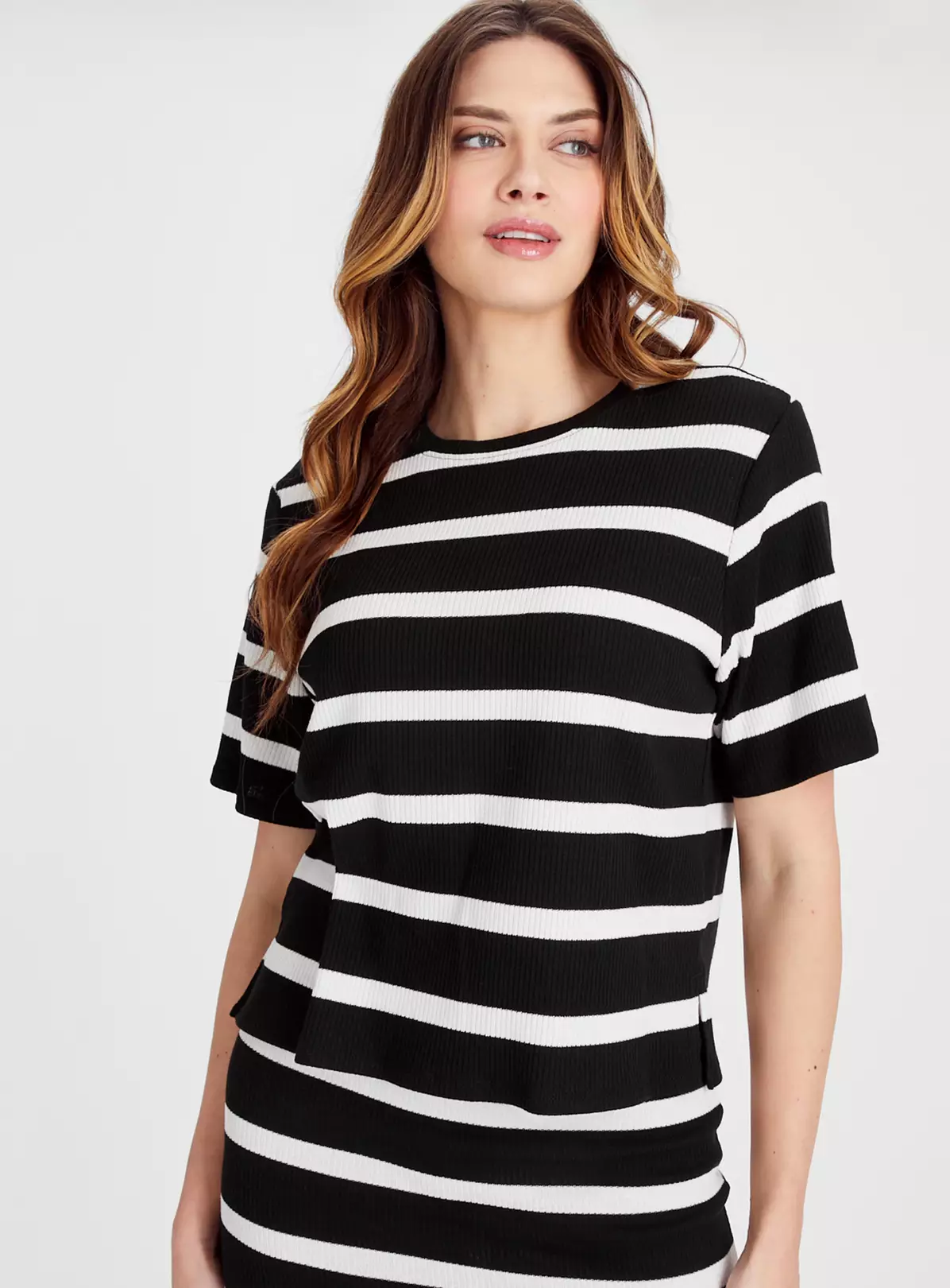 A classic style that’s not going anywhere, everyone needs a mono stripe style t-shirt in their wardrobe. In a boxy oversized fit it has a crew neckline wirh short sleeves. (Matching coord skirt available).