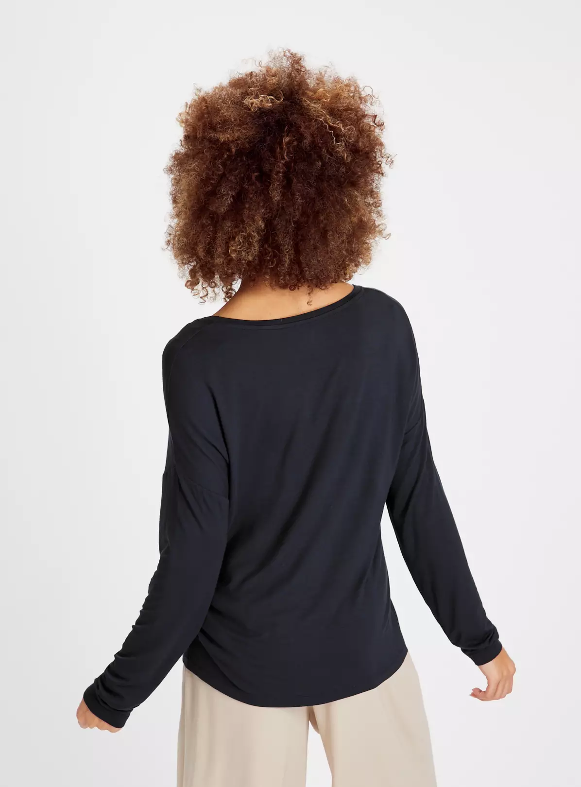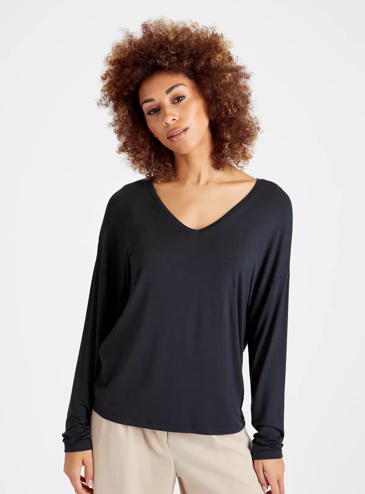 Build up your basics with our navy long sleeve top. Featuring a flattering v-neckline, it’s the perfect piece for layering during the colder months. Style with a padded gilet and denim jeans for a casual look.