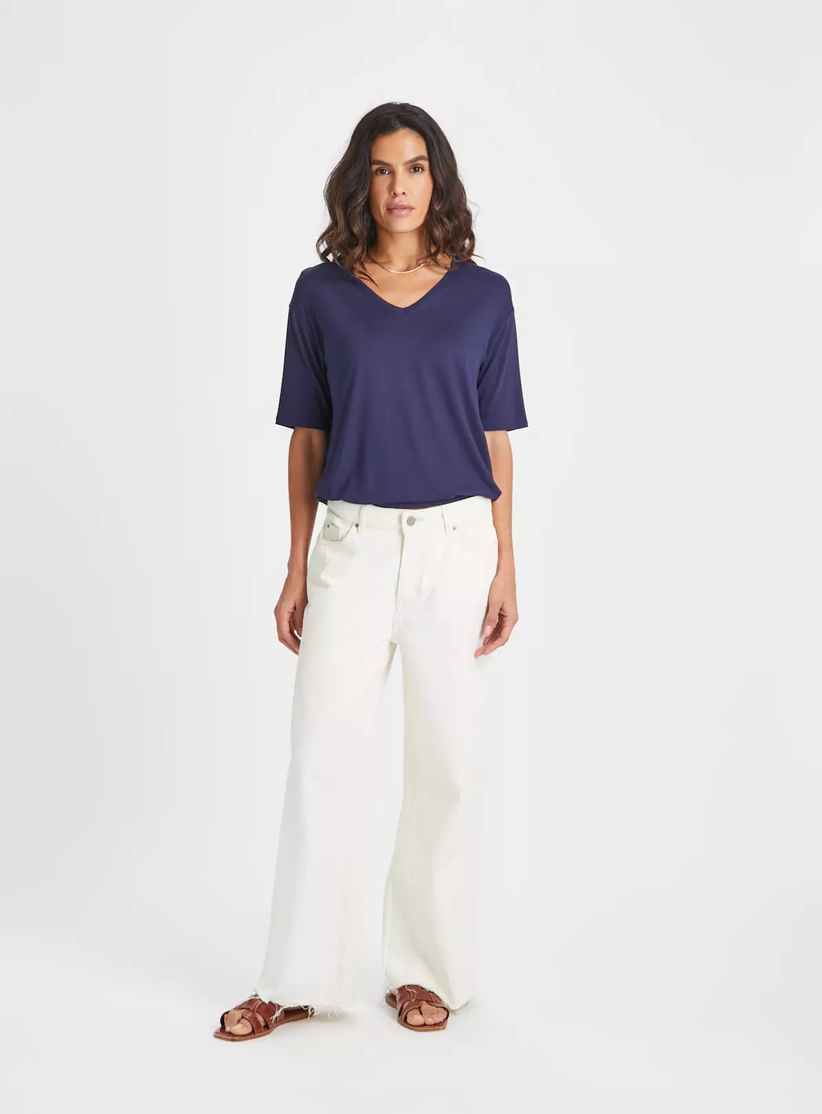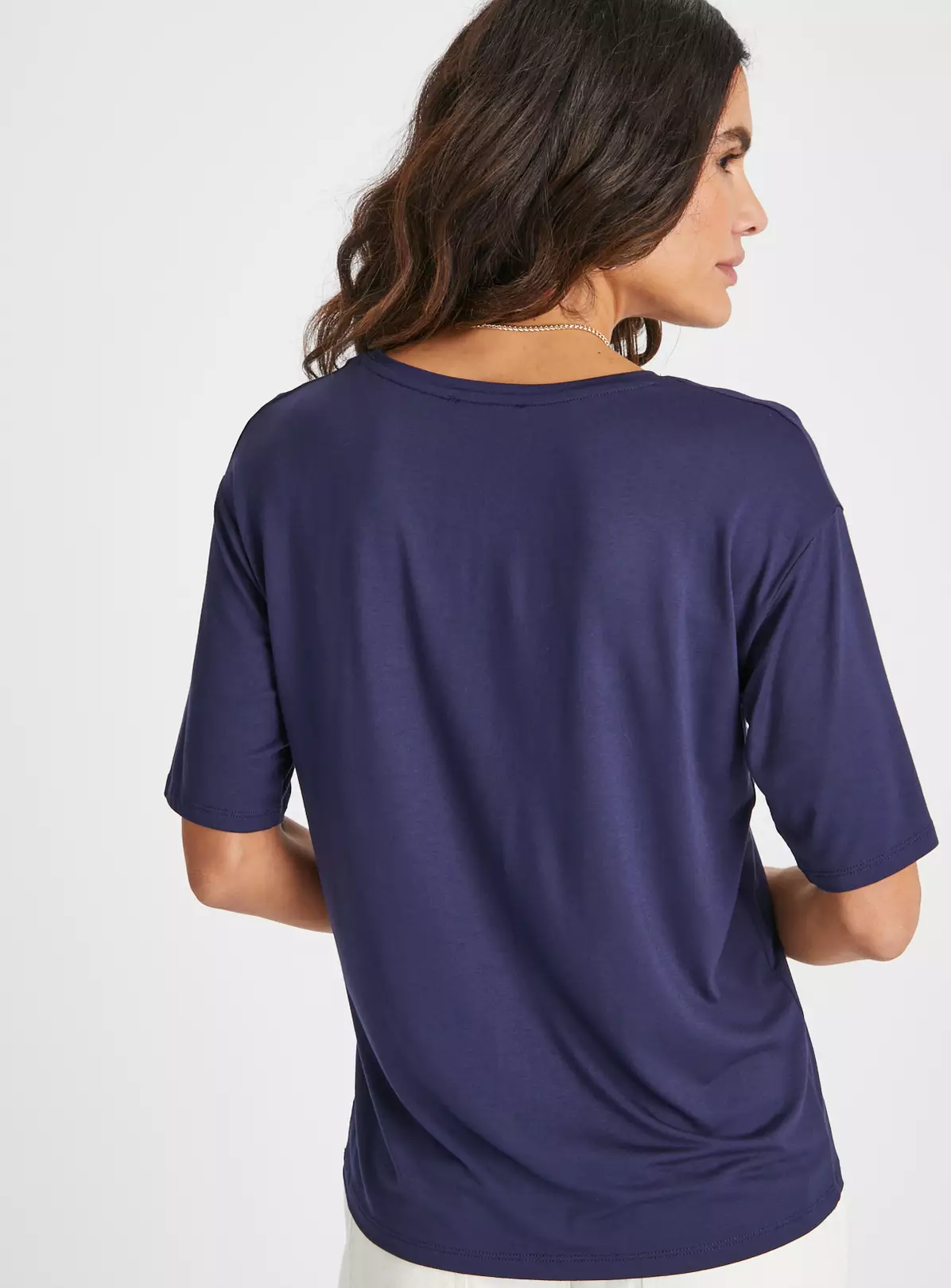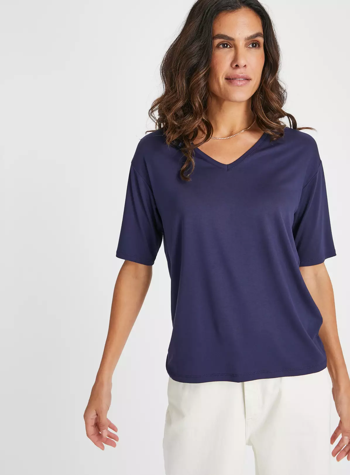 Casual and comfy, our navy blue tee comes with a V-neck in a relaxed fit with short sleeves. Made from a super soft viscose blend, it looks great paired with jeans and trainers, or jazz it up with tailored trousers for the office.