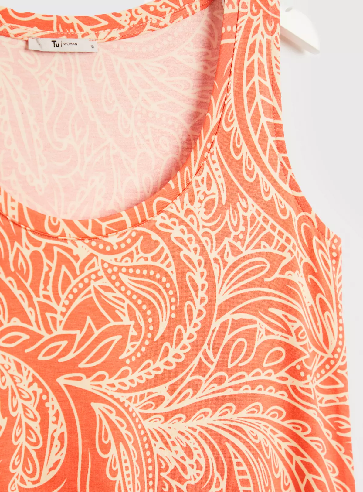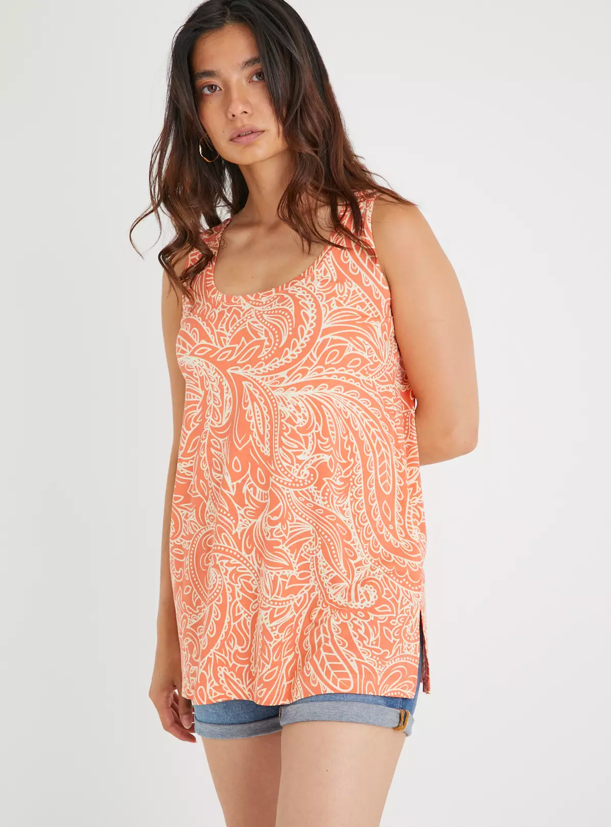 Unleash vibrant style with our orange, paisley print sleeveless top. It features a flattering scoop neckline with trendy side splits to the hem, adding a bohemian touch to your look.