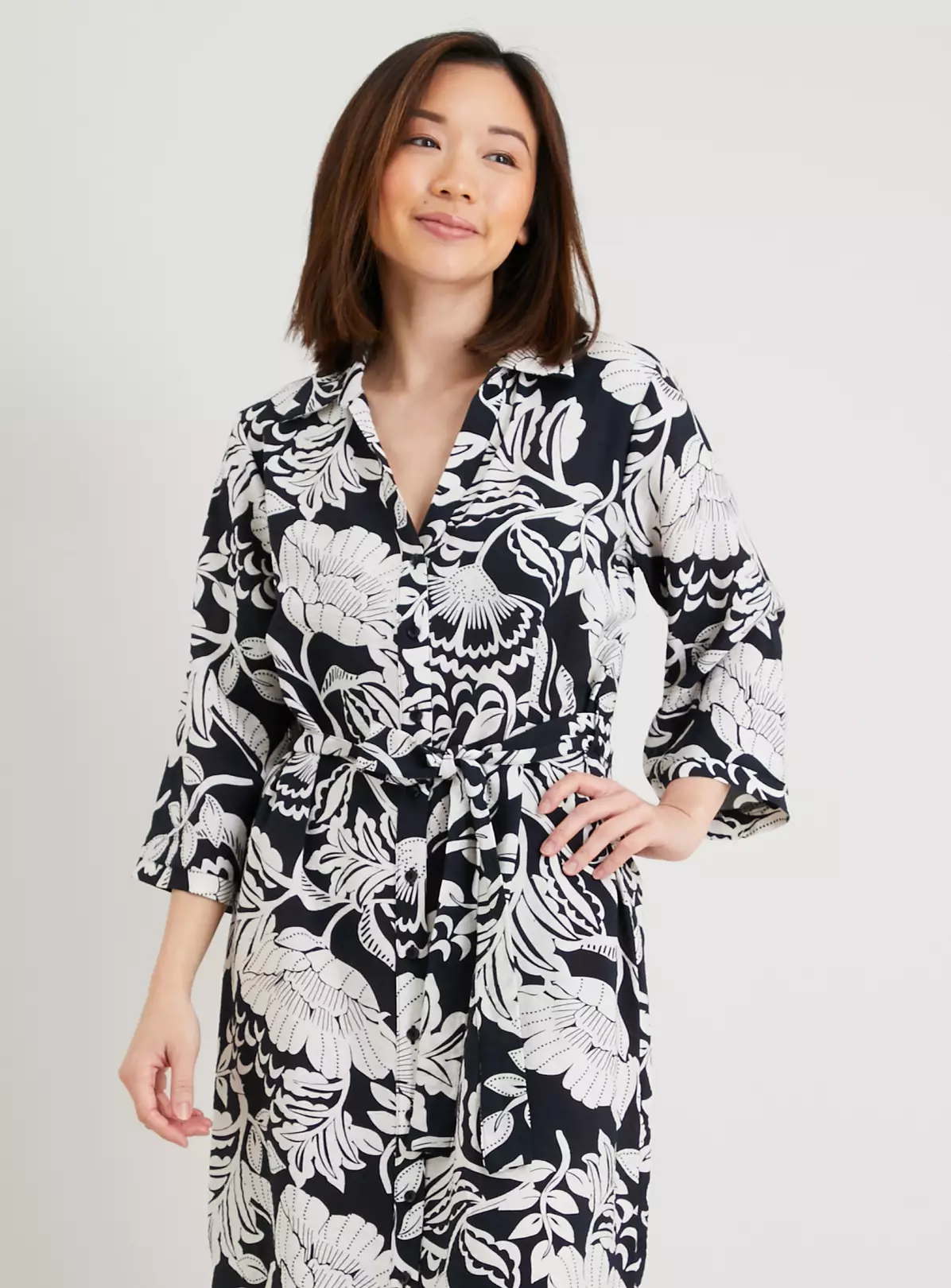 Our mono floral print shirt dress is just what your wardrobe needs this spring/summer. Made from a soft viscose blend, it has flattering half sleeves and a tie-belt to cynch you in a the waist. Perfect for your holiday suitcase, team with sandals and a floppy hat. From our Petite Collection.