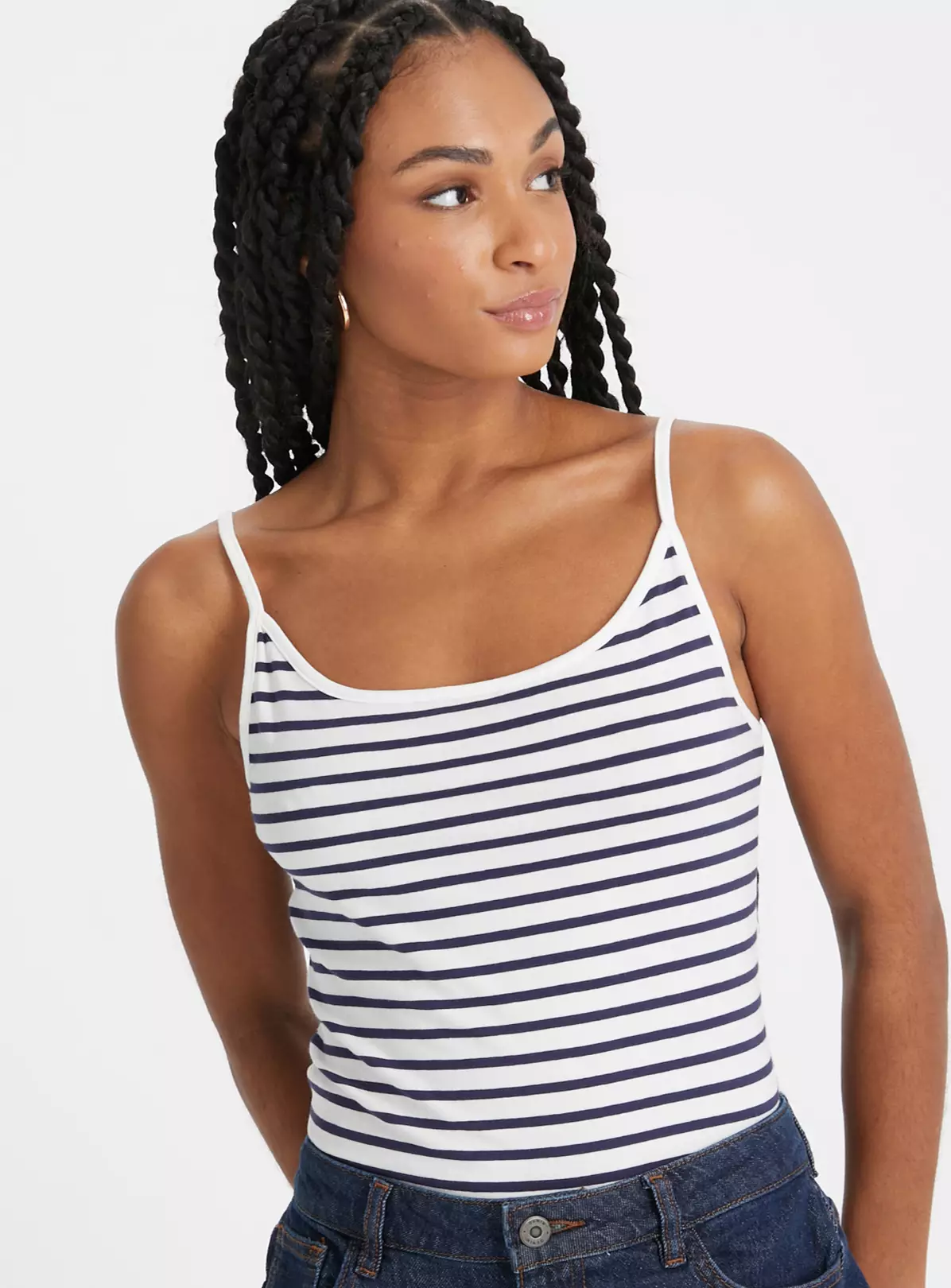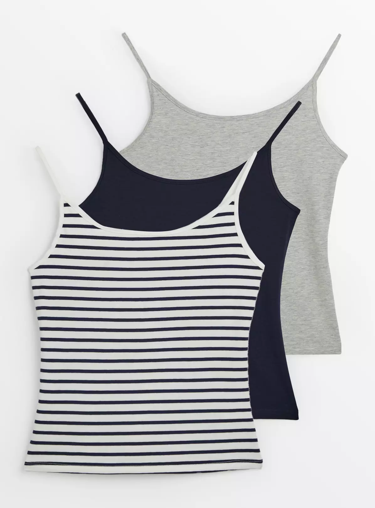This fabulous trio pack of cami vests features a plain navy, plain grey marl and navy and white stripe to mix and match across your everyday layering. In a stretchy, cotton rich fabric to keep you comfy, wear as they are in the warmer weather, or underneath a favourite shirt with jeans. So versatile!