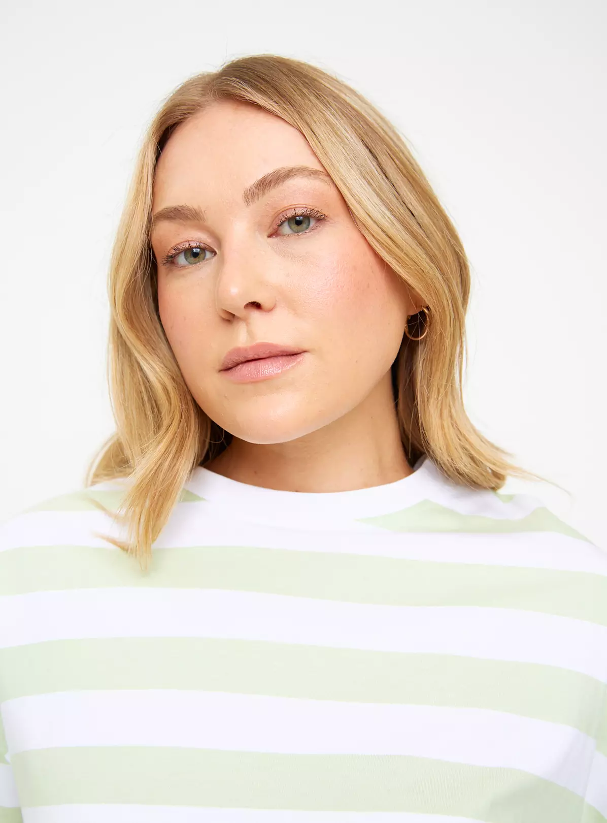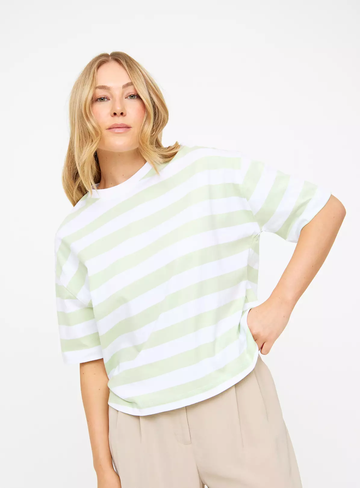 Elevated by a stripe design, our boxy fit t-shirt is an essential for your collection this season. In a gorgeous sage green stripe, it’s perfect for pairing with wide leg jeans for a laidback look.