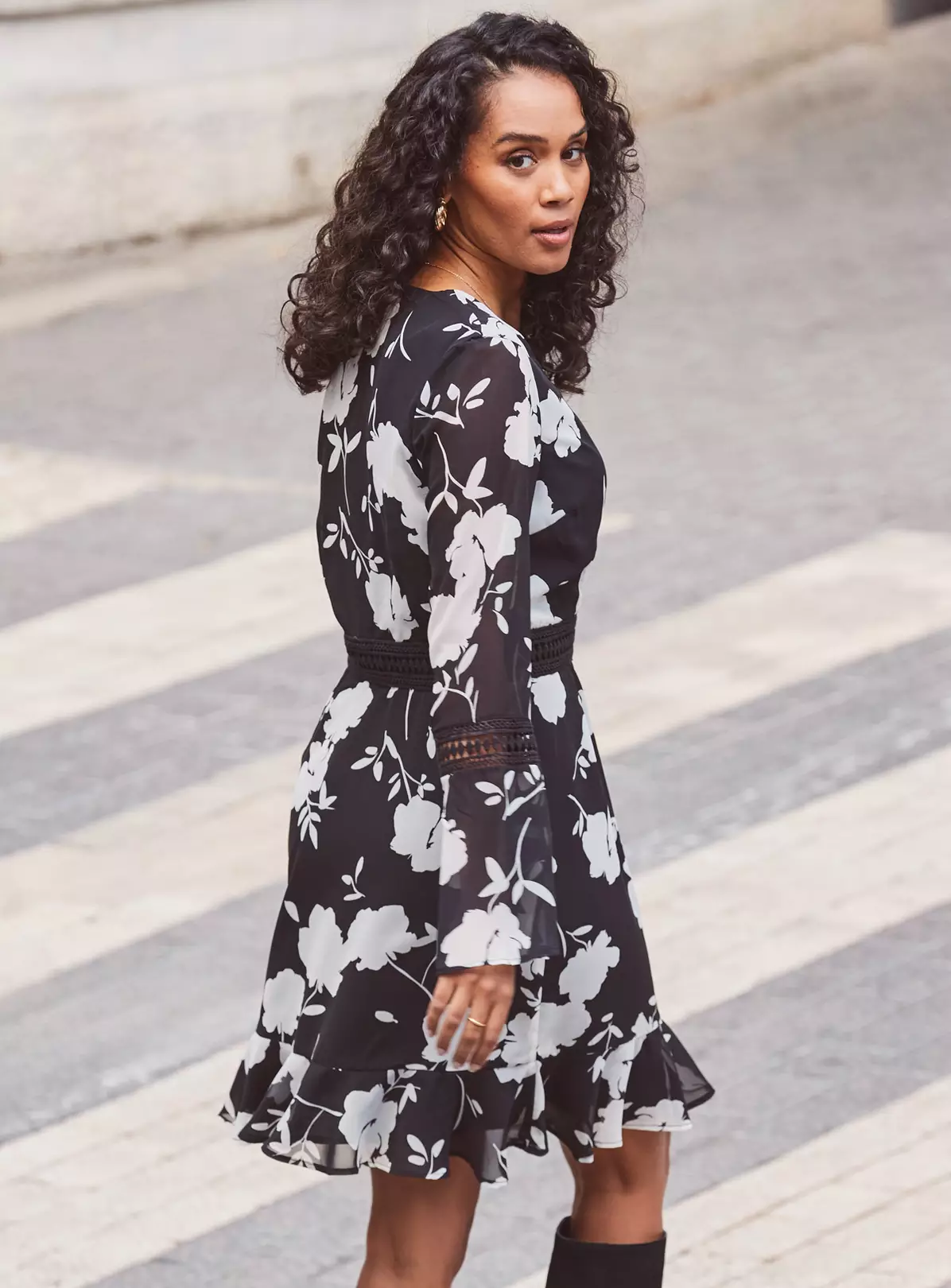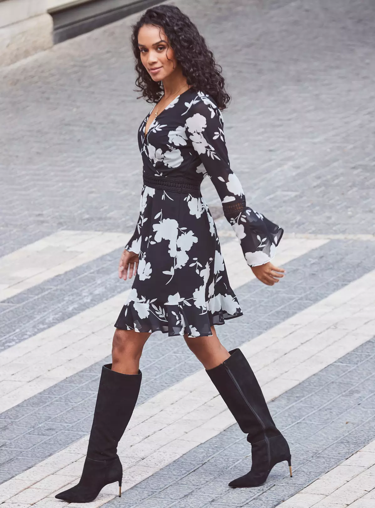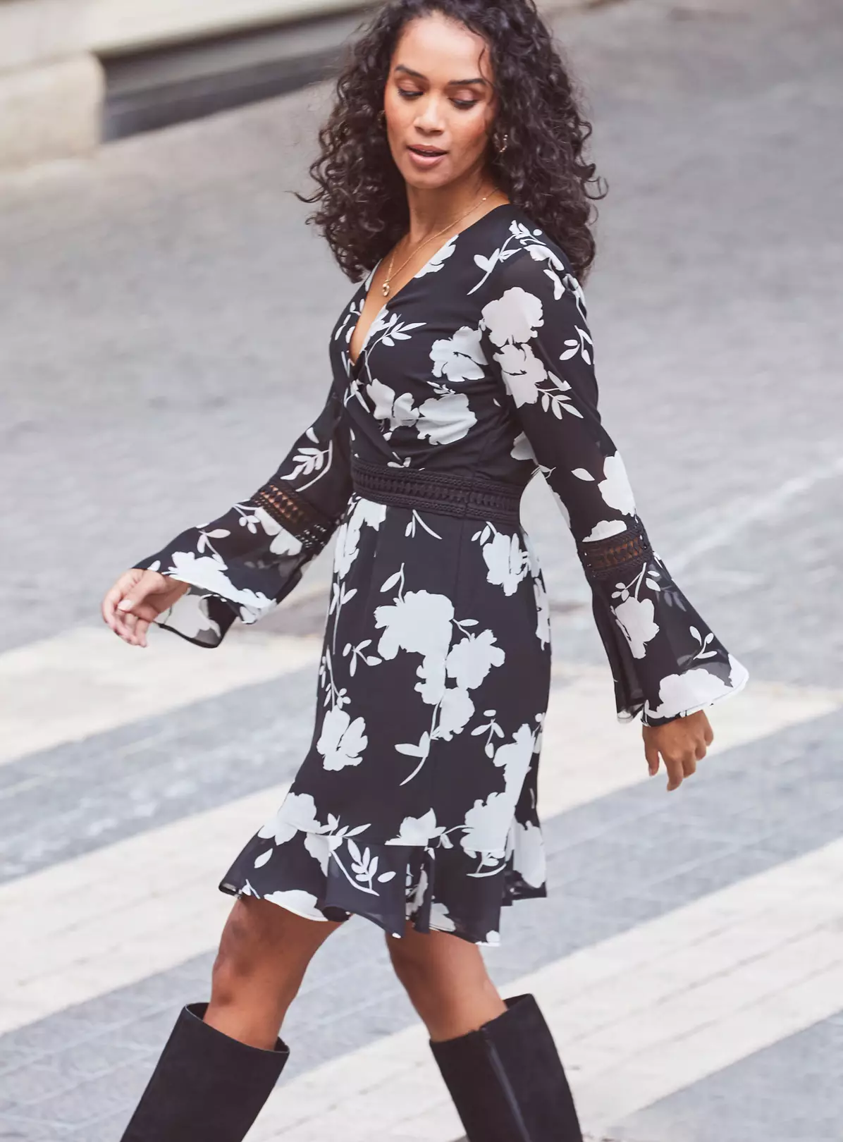A floral dress never lets you down, wrap front flatters every figure, flirty ruffle trim mini hemline, embroidered waistband cinches your middle, flute sleeves create a stunning silhouette, style with knee-high boots or strappy heels.
