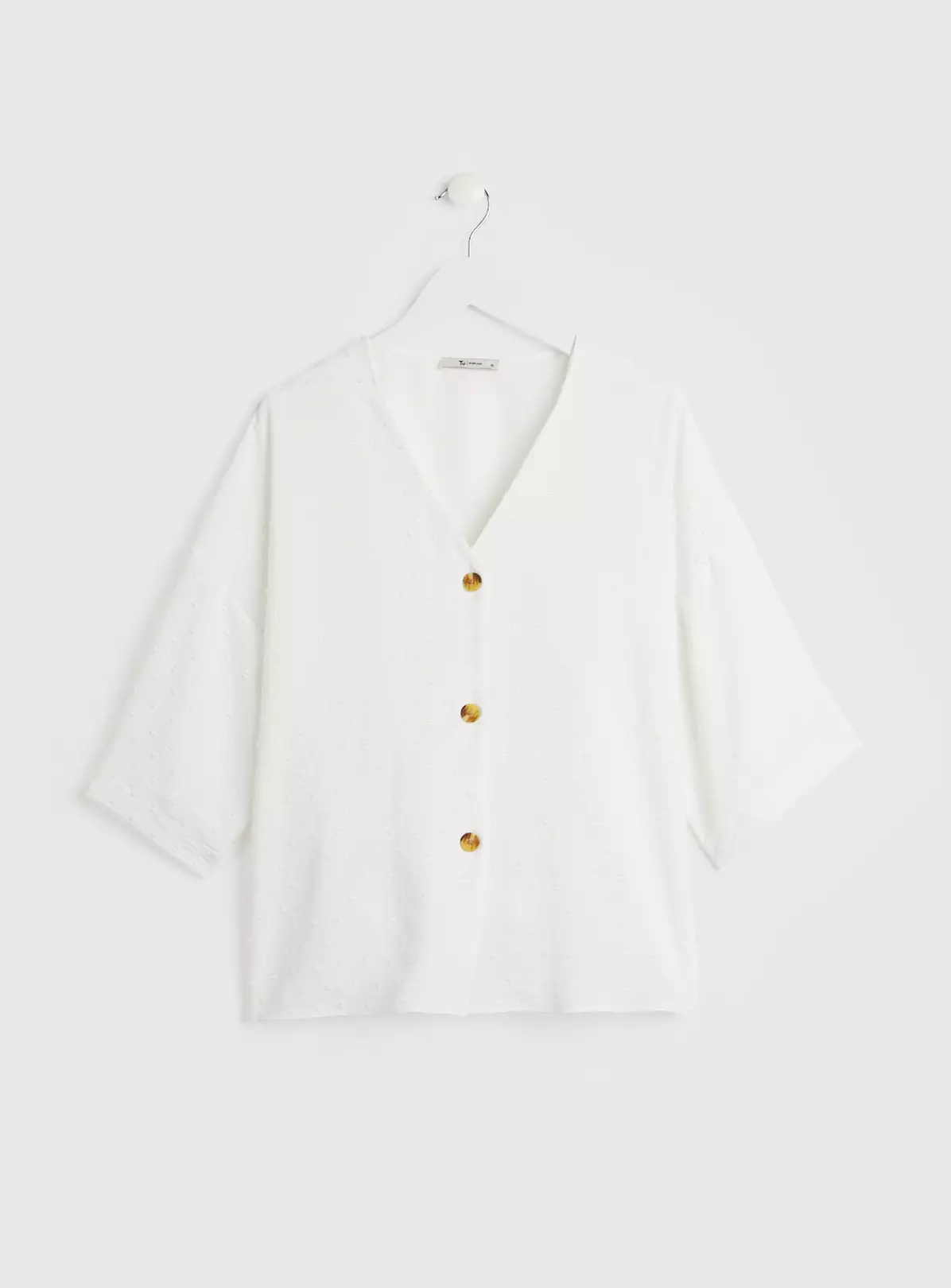Get ready to elevate your style in our white boxy blouse. Featuring a trendy V neckline, value fastening and flattering half sleeves, it’s the perfect blend of comfort and fashion. Whether you’re heading out for brunch or on a night on the town, this blouse is a versatile and fun option that will make you feel great!