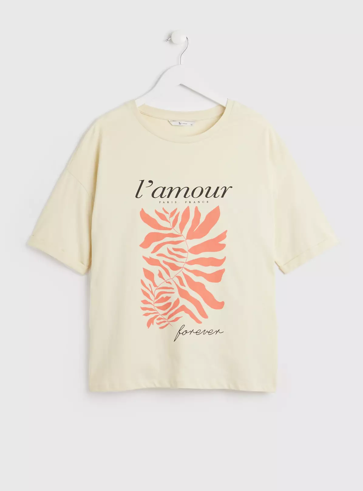 A classic basic t-shirt to add to your casual wardrobe this spring/summer. In yellow with a stylish orange leaf graphic and ‘l’amour forever’ words, it has a crew neckline and rolled short sleeves. We love it’s relaxed fit, it’s the perfect partner for denim shorts in warmer weather.